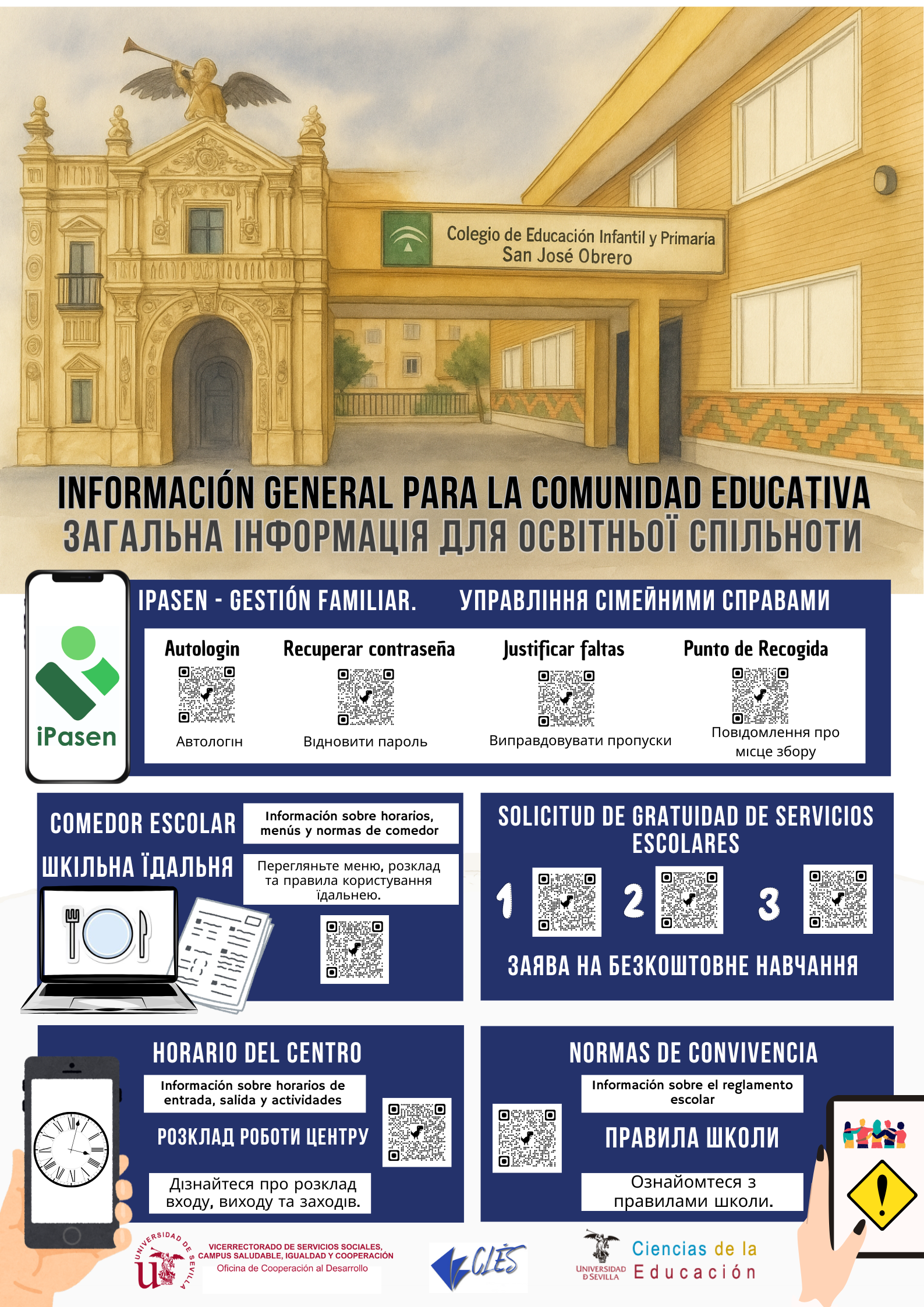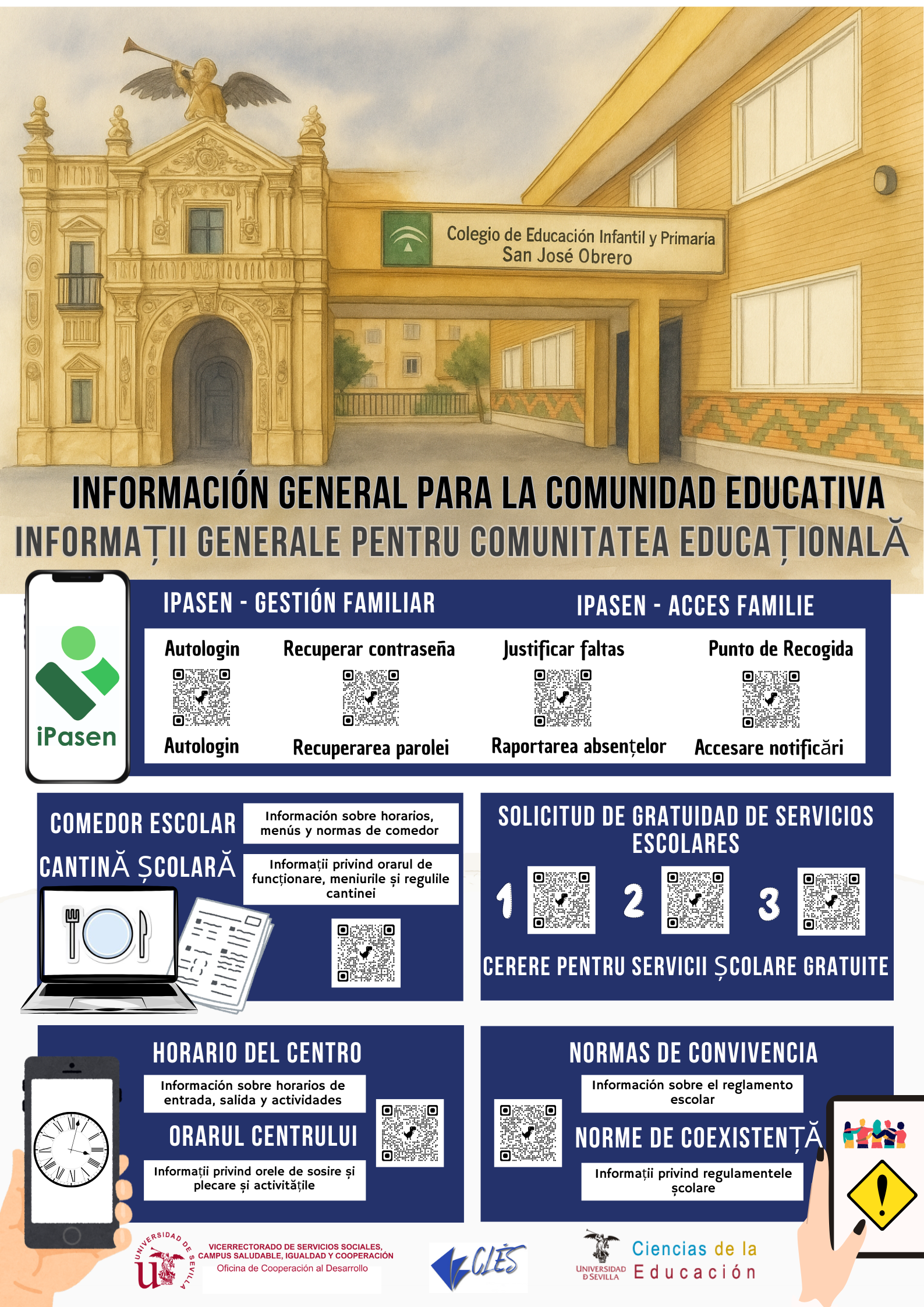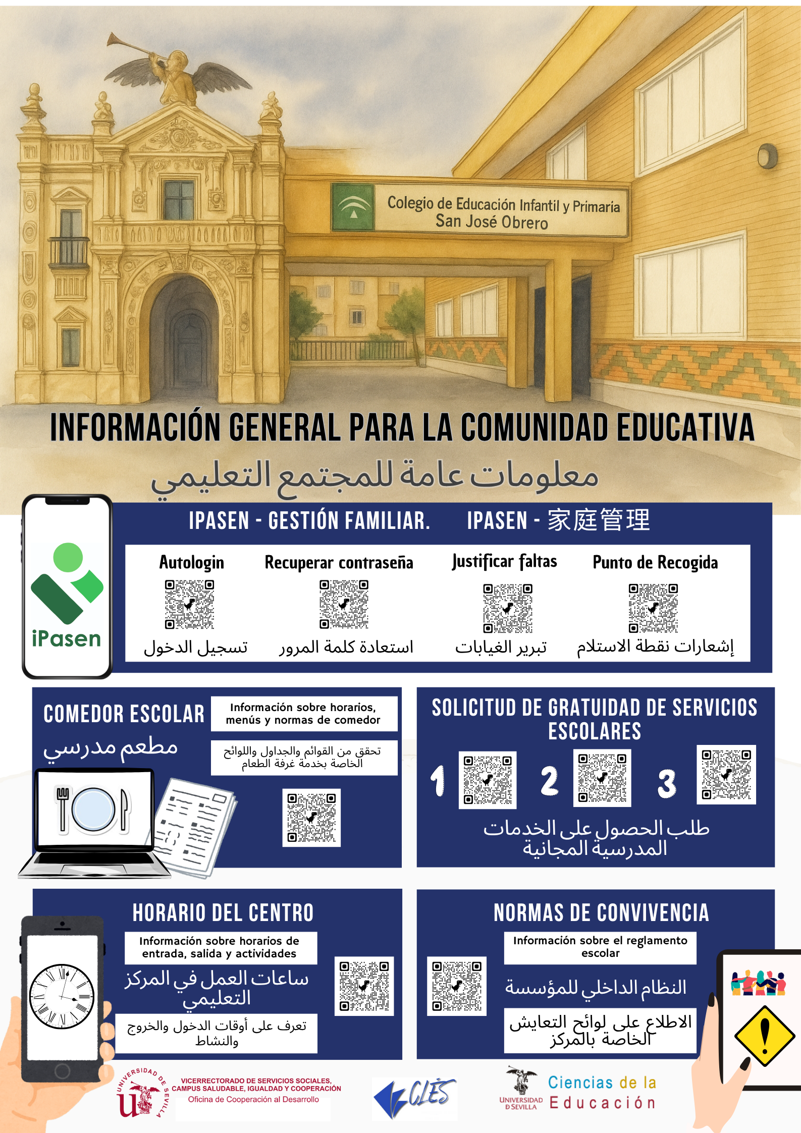 Este espacio recoge materiales informativos en varios idiomas para ayudar a todas las familias del centro a acceder fácilmente a los servicios escolares. Forman parte del proyecto «CLB PARA UNA ESCUELA INCLUSIVA, EQUITATIVA Y DE CALIDAD. INVESTIGACIÓN DESDE LA US PARA LA ESCUELA. LA COOPERACIÓN AL SERVICIO DE NUESTRO COLEGIO» desarrollado por miembros de la Universidad de Sevilla y el CEIP San José Obrero en el marco de la Convocatoria de Actividades y Proyectos de Cooperación al Desarrollo de la US 2024/2025