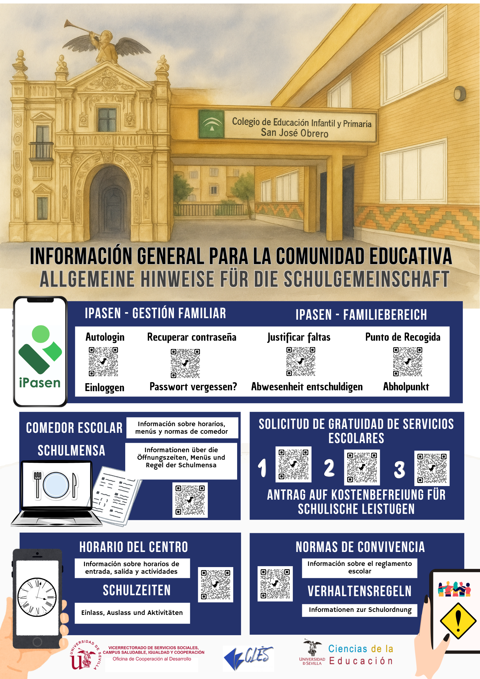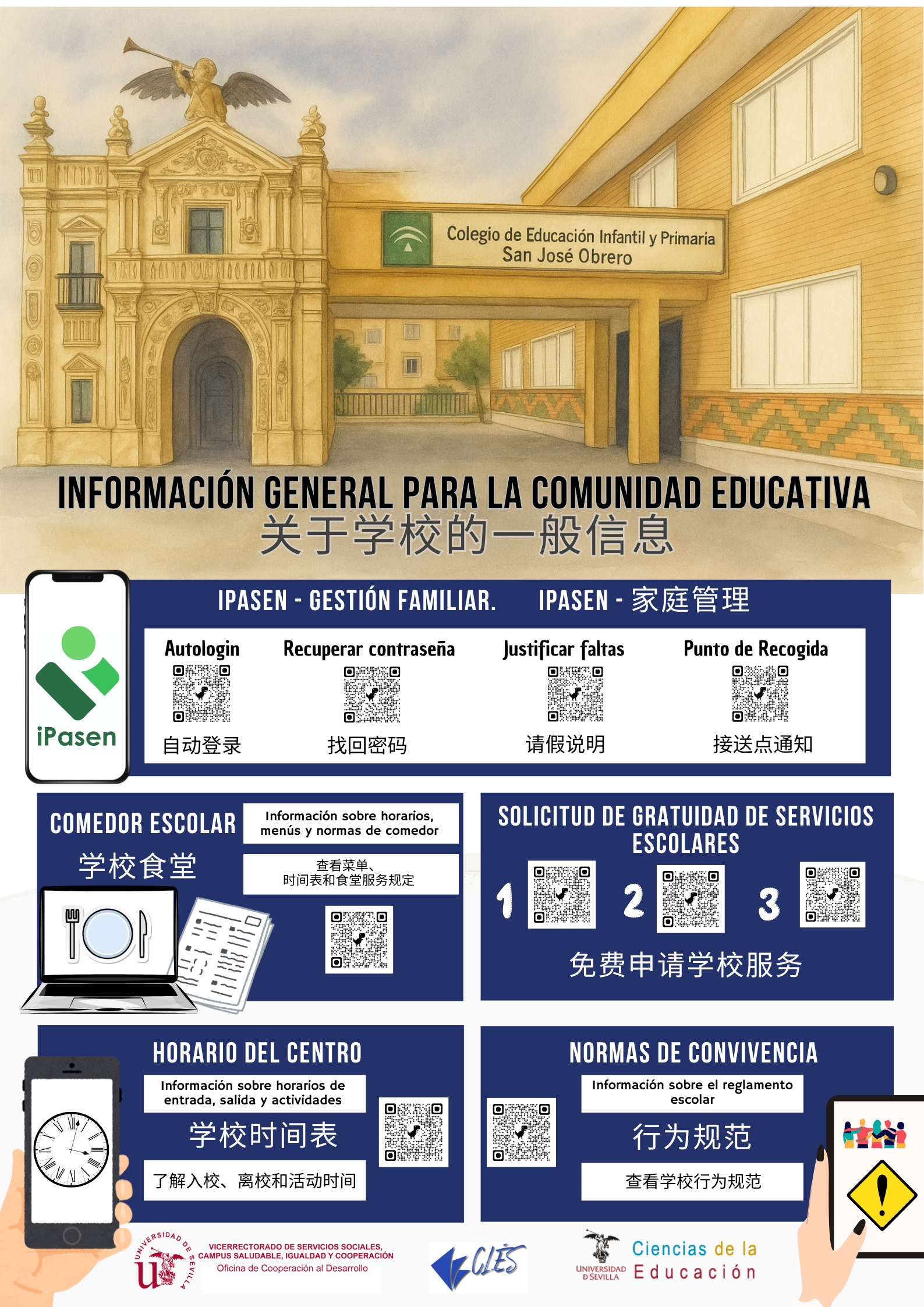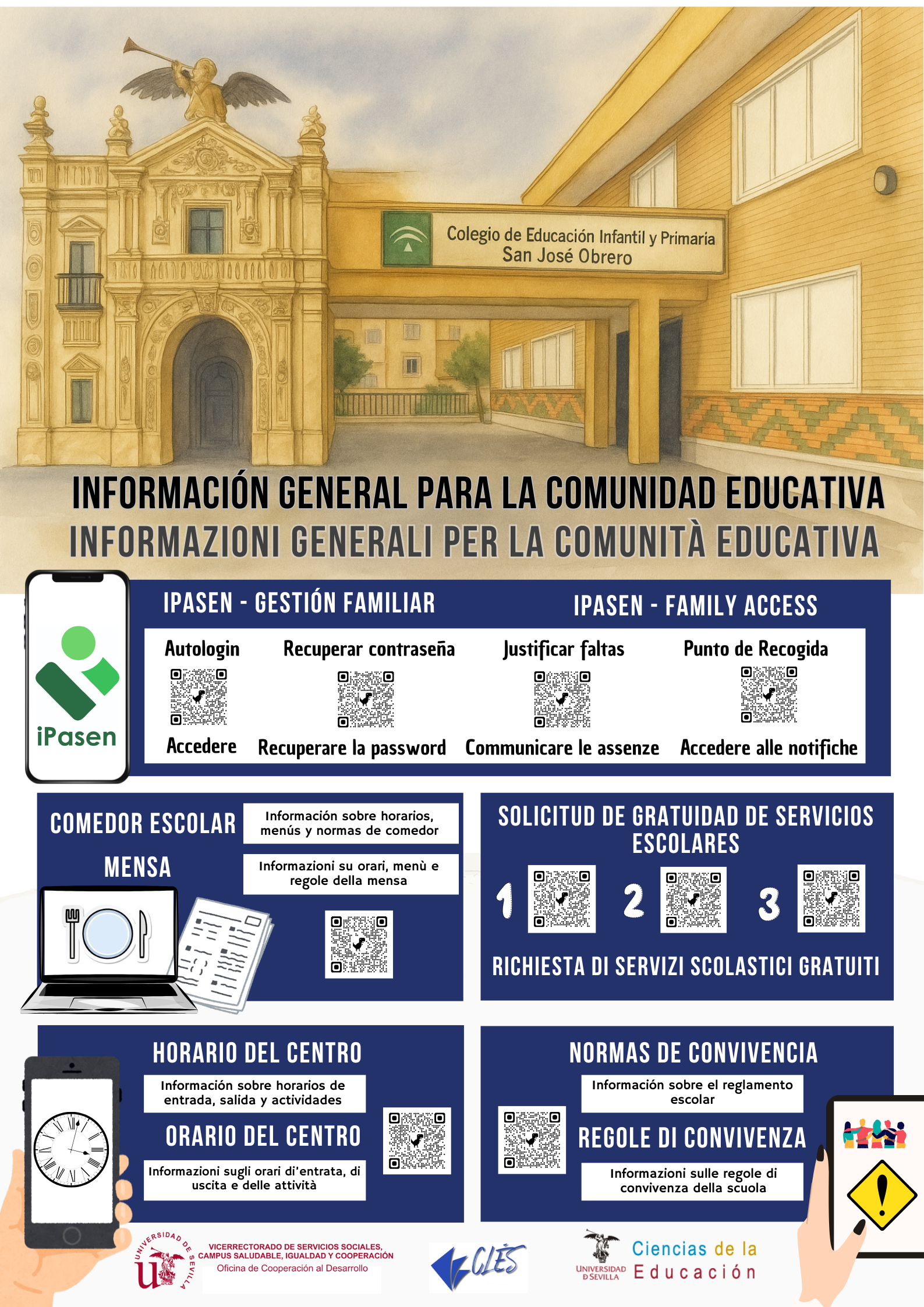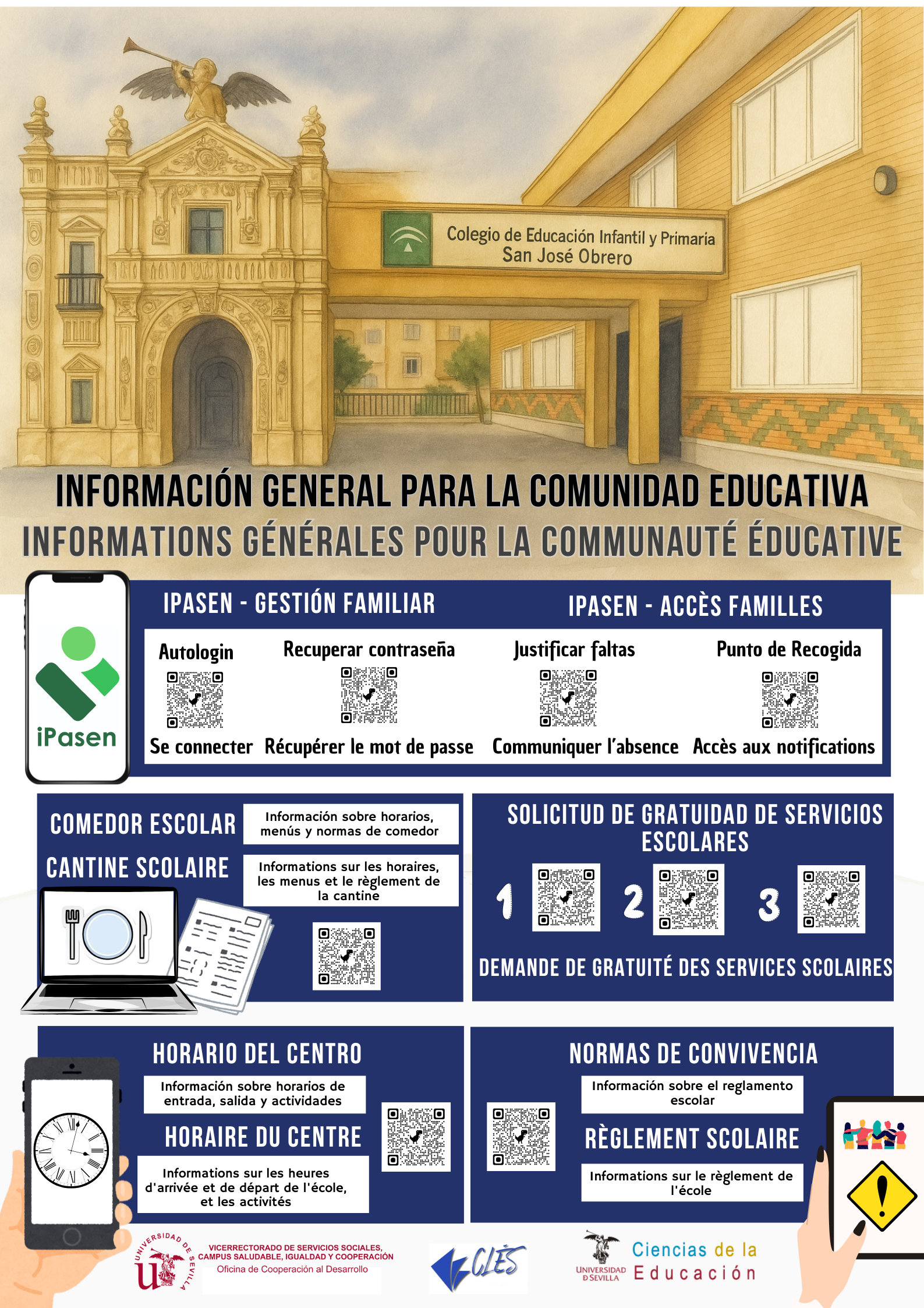 Este espacio recoge materiales informativos en varios idiomas para ayudar a todas las familias del centro a acceder fácilmente a los servicios escolares. Forman parte del proyecto «CLB PARA UNA ESCUELA INCLUSIVA, EQUITATIVA Y DE CALIDAD. INVESTIGACIÓN DESDE LA US PARA LA ESCUELA. LA COOPERACIÓN AL SERVICIO DE NUESTRO COLEGIO» desarrollado por miembros de la Universidad de Sevilla y el CEIP San José Obrero en el marco de la Convocatoria de Actividades y Proyectos de Cooperación al Desarrollo de la US 2024/2025